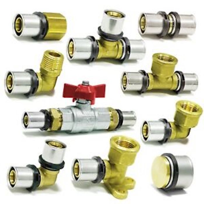 Пресс-фитинг из композитной трубы из специальной латуни. Прессующая втулка из нержавеющей стали