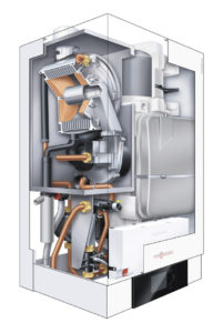 В конденсационных котлах установлен второй теплообменник, на поверхности которого конденсируется вода. Теплый газ, который не был использован в главном теплообменнике, используется во втором теплообменнике, где с его помощью нагревается уже успевшая охладиться вода из обратной линии. Образующийся при этом конденсат выводится с помощью дренажной трубы в канализацию.