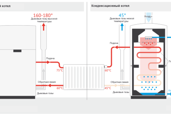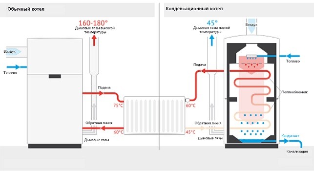 Высокая эффективность конденсационных достигается за счет использования температуры уходящих газов в качестве дополнительного источника тепла. В обычных котлах тепло, содержащиеся в выхлопных газах выпускается через дымоход наружу.